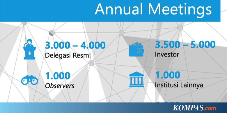 JAKARTA, KOMPAS.com - Pertemuan IMF-World Bank Annual Meeting 2018 yang diselenggarakan di Bali, pekan depan, akan dihadiri 20.000 lebih peserta yang sebagian besar berasal dari 189 negara anggota IMF dan Bank Dunia.