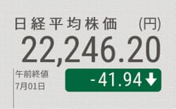 1日午前の東京株式市場で日経平均株価は反落し、前日比41円94銭(0.19%)安の2万2246円20銭で前場を終えた。米景気の回復期待の強まりや円相場の下落で上昇して始まったが、国内景況感の悪化で次第に売りが広がった。新型コロナウイルスの感染第2波や「香港国家安全維持法」成立による米中関係悪化への警戒が重荷だった。