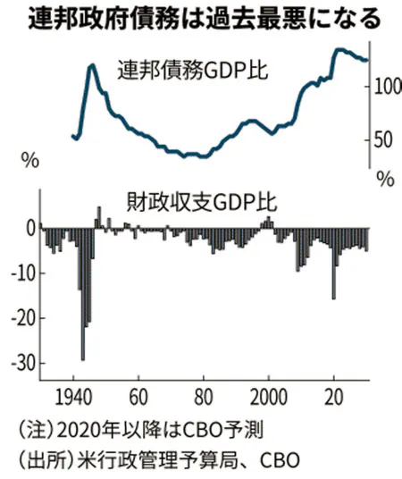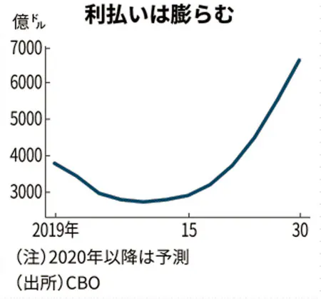 そのため、30年度の利払い費(利息収入を差し引いたネット)は6640億ドルと、20年度(3380億ドル)の約2倍に膨らむ。30年度は国防費(8880億ドル)に近づく規模になり、米財政を大きく圧迫しそうだ。