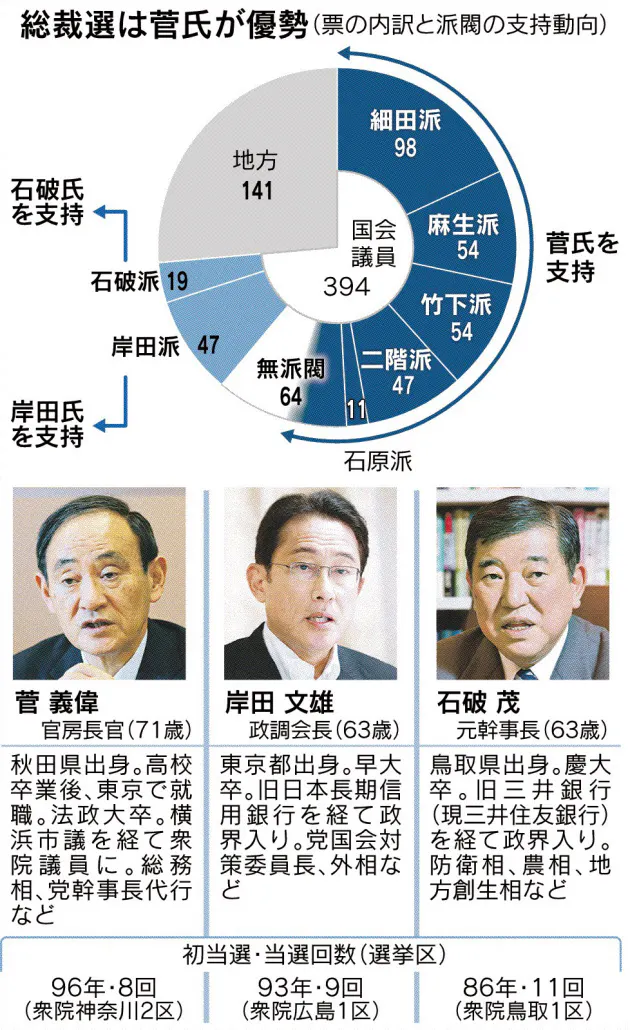 菅義偉官房長官は2日、安倍晋三首相の後継を決める自民党総裁選に出馬すると正式に表明した。「新型コロナウイルスの感染拡大防止と社会経済活動の両立を図る」と述べた。立候補者は岸田文雄政調会長、石破茂元幹事長を含む3氏で確定した。14日に新総裁を選出する。(関連記事総合2、政治面に)