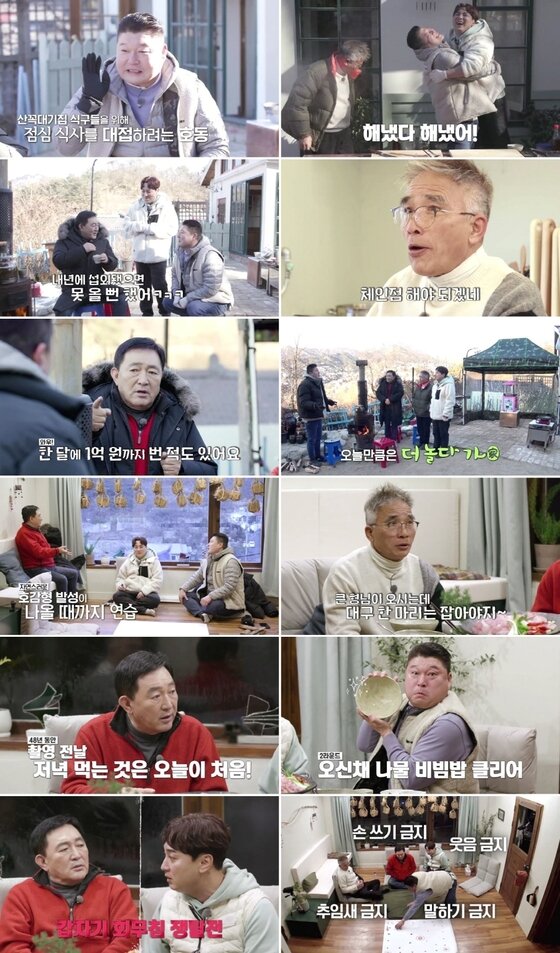 임채무는 마당 난롯가에 자리하자마자 타고난 '주당'의 주종별 손목 스냅을 선보여 폭소를 유발했다. "오늘은 호동이가 점심을 준비했다"는 말에 "그냥 가겠다"고 너스레를 떤 임채무는 꼬막비빔밥을 맛보자마자 "(강호동이) 벌써 조리사 자격증을 딴 것 같은데"라고 감탄을 연발했다. 임지호마저도 "체인점을 내야겠다"며 극찬했다. 이들은 '폭풍 수저질'로 점심을 즐겼다.