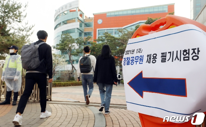 (서울=뉴스1) 김진환 기자 = 2021년 1차 경찰공무원(순경) 채용 필기시험이 치러진 6일 오전 서울 중구 성동공업고등학교 고사장으로 응시생들이 들어가고 있다. 경찰청에 따르면 이번 시험에는 2907명 선발 예정에 4만6687명이 응시해 16대 1의 경쟁률을 기록했다. 2021.3.6/뉴스1